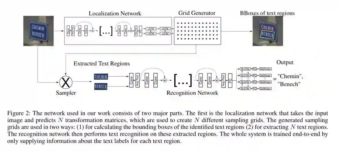 端到端的模型 loss 设计困难,通常识别只专注于文本检测或文本识别,但本文使用了 STN 来进行文本检测结合 ResNet 进行识别。先通过 STN 检测文本位置,输出特定区域的文本图片后再通过 CNN 识别文本。