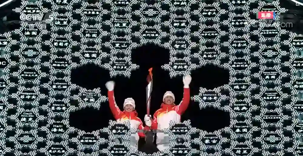经过多位国家队运动员轮番传递,越野滑雪运动员衣拉木江和北欧两项运动员赵嘉文一起,将最后一棒火炬插在大雪花火炬台的中心。
