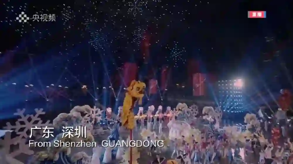 在开幕式前的热场环节中,深圳展示出多番科技大秀。其10万流明激光投射灯投射出各式团,点亮深圳夜空,随后2022架无人机队伍缓缓升起,展现出漫天的雪花,通过矩阵组合变换,组成“冰墩墩”和“雪容融”两个冬奥吉祥物。