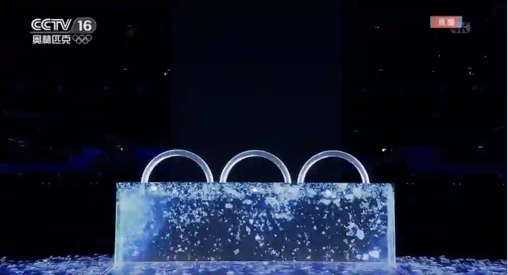 随着虚拟冰球来回撞击之后,冰立方开始碎裂,一个晶莹剔透的冰雪五环破冰而出。这个冰雪五环内部装有电池,全部为内部供电。