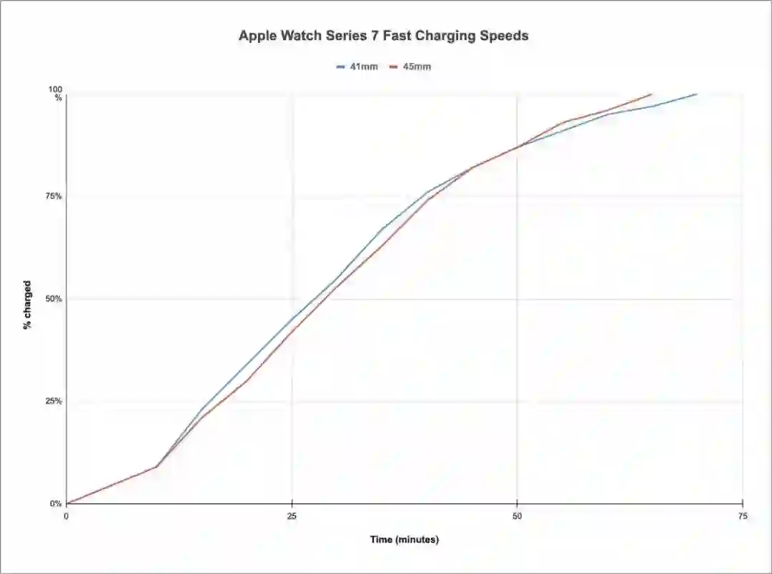 上一代的Apple Watch Series 6 至少需要两个小时才能充满电,但 Apple Watch Series 7 Cellular 版本几乎将充电时间减少了一半。在一系列测试中,Apple Watch Series 7充满电的时间在大约在65到75分钟。