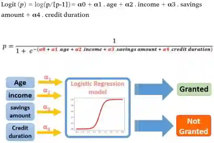 在逻辑回归中,目标 y 是二元的 ( 授予 p = 1 /不授予 p = 0) 和 授予信贷的概率 p。目标是找到下面的公式的系数 αi 来预测 P 的 logit 变换。