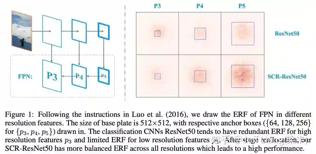 这个时候,我们将网络的有效感受野ERF[6]与网络算力分配模式联系了起来。在Faster RCNN + FPN这一经典baseline中,我们希望FPN的各层有合适能力去检测对应大小的物体(Anchor Size)。当我们画出R50-FPN的各层的ERF时,发现对于P3而言(小物体),ERF挺大有冗余,但对于P5而言(大物体),ERF又不够有点稀疏,见下图Figure 1右上角。这也就是直接应用Res50作为backbone的问题,经过我们的stage的重分配之后,可以明显看到各层FPN有更加平衡的ERF,保证了最后的性能。