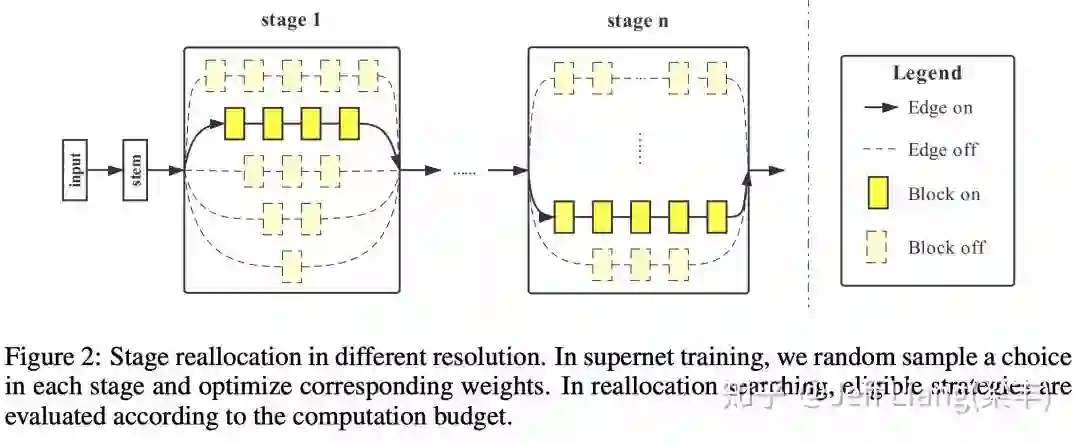 为了进行算力重分配,我们构建了一个两级搜索来配合这个庞大的搜索空间。我们先进行stage的搜索,然后进行spatial的搜索。简单来说,先搜索各个stage的block number,再搜索各个位置的dilated conv的rate,因为dilated conv通过改变采样点的稀疏程度,可以改变网络的感受野。
