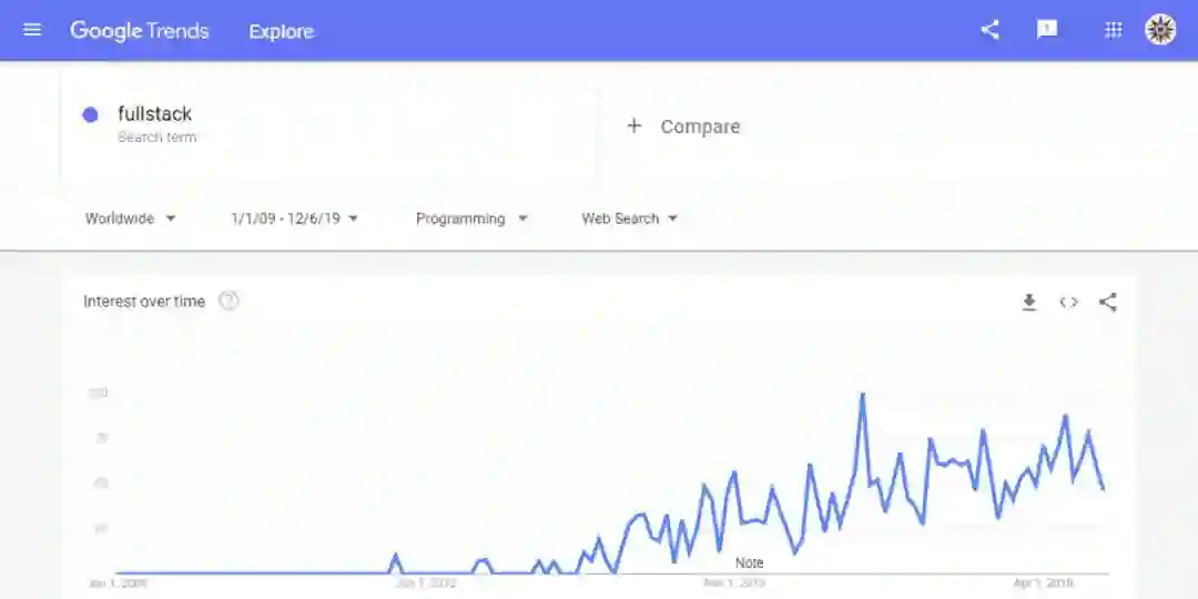 奇怪的是,人们对“全栈”这个词的好奇心在不断增加。2009-2019年期间,Google 搜索词语趋势快照显示,在过去五年中,“全栈”这个词的搜索次数急剧增加,而且年年创新高。