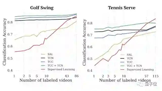 谷歌还将TCC与其它有监督学习算法进行对比。在识别高尔夫挥杆和网球发球这个两个动作时,有监督学习需要50个标记样本才能达到和TCC一样的准确度,而TCC在仅有一个标记样本的情况下就已经有很高准确度了。