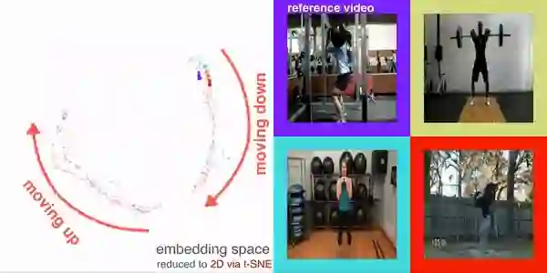 首先,训练算法通过单独提取每个帧来产生视频帧的嵌入。然后选择用于TCC学习的两个视频,使用其中一个作为参考视频,用它的帧嵌入来识别来自第二个视频相同动作的最近帧。