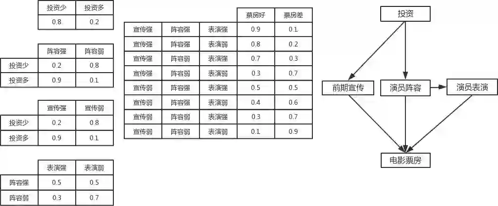 从模型图中可以很清晰看出每一个项目与电影票房之间的关系。拥有了这些关系,就可以根据其中一些变量推断出其他变量的情况。这里将每一个变量都离散化为2个等级——好和差,然后就可以根据分析得到的经验构建心目中的条件概率分布表,如图9-6所示。