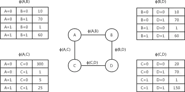 无向图因为没有方向,也就没有CPD,但是无向图模型还是有自己的办法。无向图模型中同样的一个个类似CPD的东西被称作Factor ,像有向图中的节点拥有自己的CPD一样,Factor也有自己的表示形式。它也可以像CPD一样用表格的形式表示。