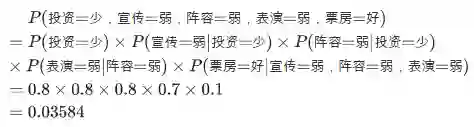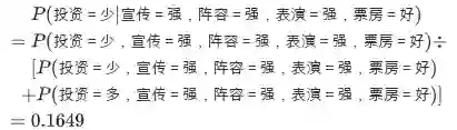 计算联合概率(Joint Probability)。一个投资少、宣传弱、阵容弱、表演弱且票房好的电影出现的概率有多大?公式如下: