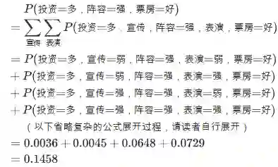 计算边际概率(Marginal Probability)。投资多,阵容强,票房好,其他无所谓的电影出现的概率有多大?公式如下: