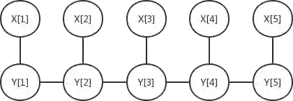 其中P(X,Y)就是图模型的联合概率分布,而在有些问题中,对X单独建模十分困难,而对X,Y联合建模则相对容易些,这样的问题需要特殊的条件约束。条件随机场不允许任何一个Factor中只包含X的节点,Factor中要么包X和Y,要么只包含Y。于是上面的公式就可以做一定的修改,使得在建模时避免这些问题。这里给出一种相对简单的条件随机场,如图9-8所示。