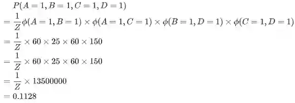 在上面的例子中,如果要求P(A=1,B=1,C=1,D=1)的概率,那么有: