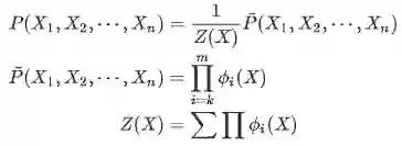 从代码中可以看出,没有了有向图的依赖,无向图少了很多约束,计算公式反而更简洁。当完成归一化后,这些计算结果就可以像有向图那样表示随机变量的联合概率。这些联合概率实际上代表了无向图模型的概率分布,这种分布被称为Gibbs分布 。Gibbs分布就是利用Factor表示的无向图模型的概率分布,它的形式如下所示: