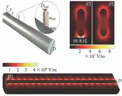 图5 一维倏逝电磁真空中的腔量子电动力学系统:银纳米腔放置在金属或介质纳米线的上方,间隔2 nm,单偶极子放置在间隙中的“热点”处,工作波长为780 nm。右上方是有无纳米线时银纳米腔周围的电场分布,下方的电场分布是银纳米线上的一维倏逝波模式[67]