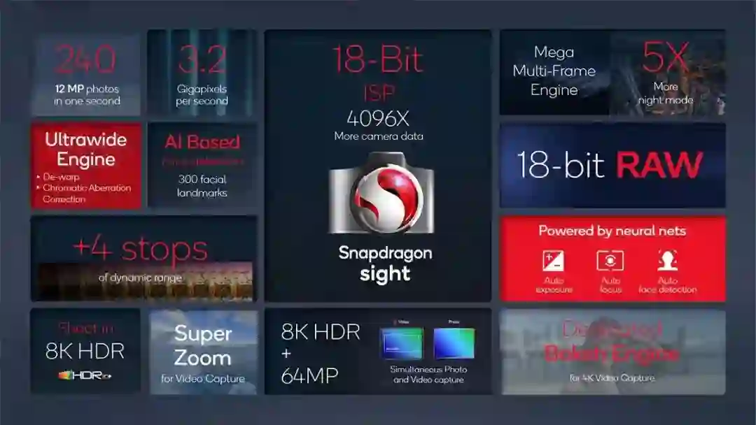 今年的 ISP 每秒钟可处理的像素数为 32 亿,支持拍摄 8K、HDR10+ 的视频。正常的 8K 视频,每帧需要捕获 3300 万像素,现在的 ISP 可处理的数据量则远高于 3300 万,所以在拍视频的时候,你的防抖裁切可以裁得更少,甚至不裁,因为 ISP 可以让 CMOS 的所有像素全部工作,来为整个 7680*4320 的 8K 画面做 EIS 防抖。