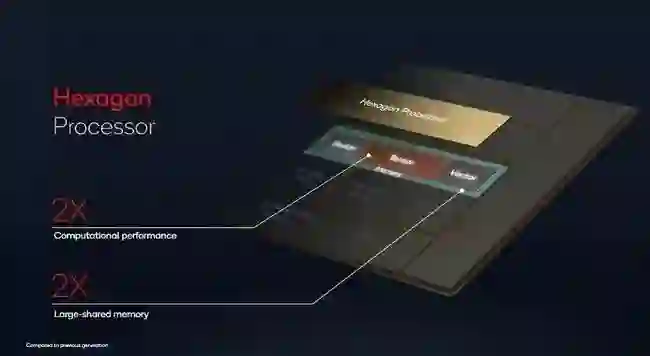 最后来说说 AI 的应用。硬件上,官方表示 Hexagon 张量加速器的性能相比上代翻了一倍,并且共享内存也翻了一倍。有了大内存之后,我们就可以载入一个完整的神经网络,再也不需要分块了。
