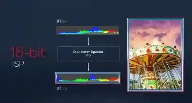 影像方面。今年的骁龙 8 依然沿用了去年的 3 ISP 架构,不过从之前的 14-bit 升级到了 18-bit,也就是说,我们拍照可以直接导出 18-bit 的 RAW,而支持 18-bit 的 ISP 可以让色彩过度更平滑,理论上动态范围可以增加 4 挡。