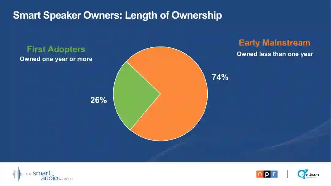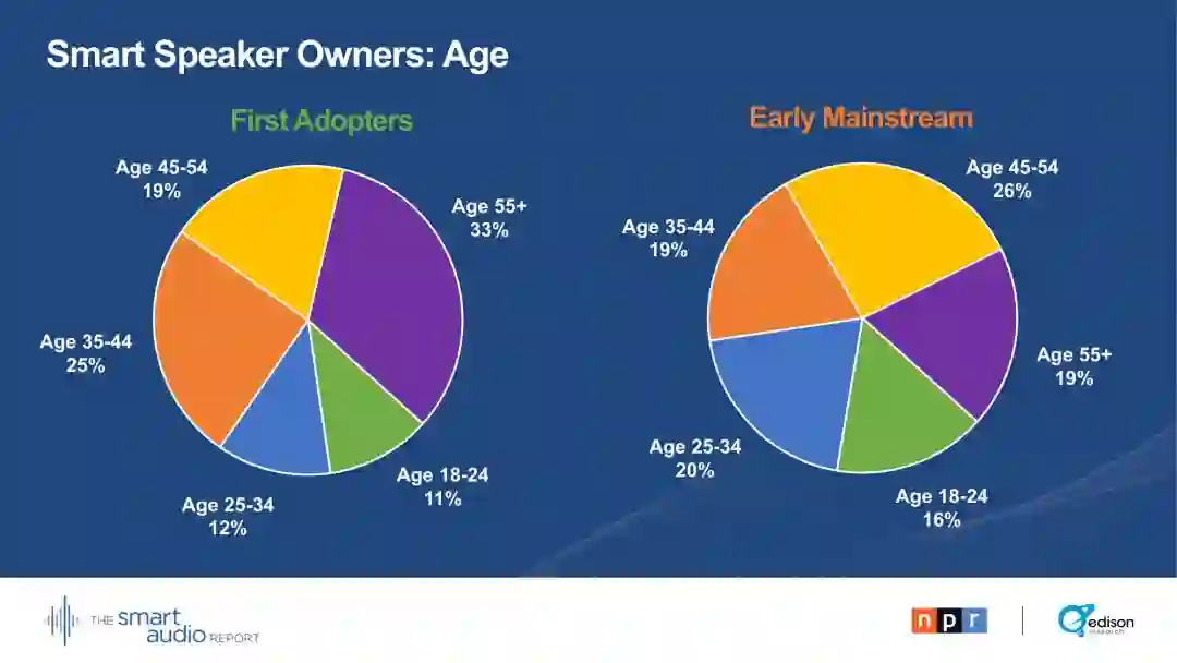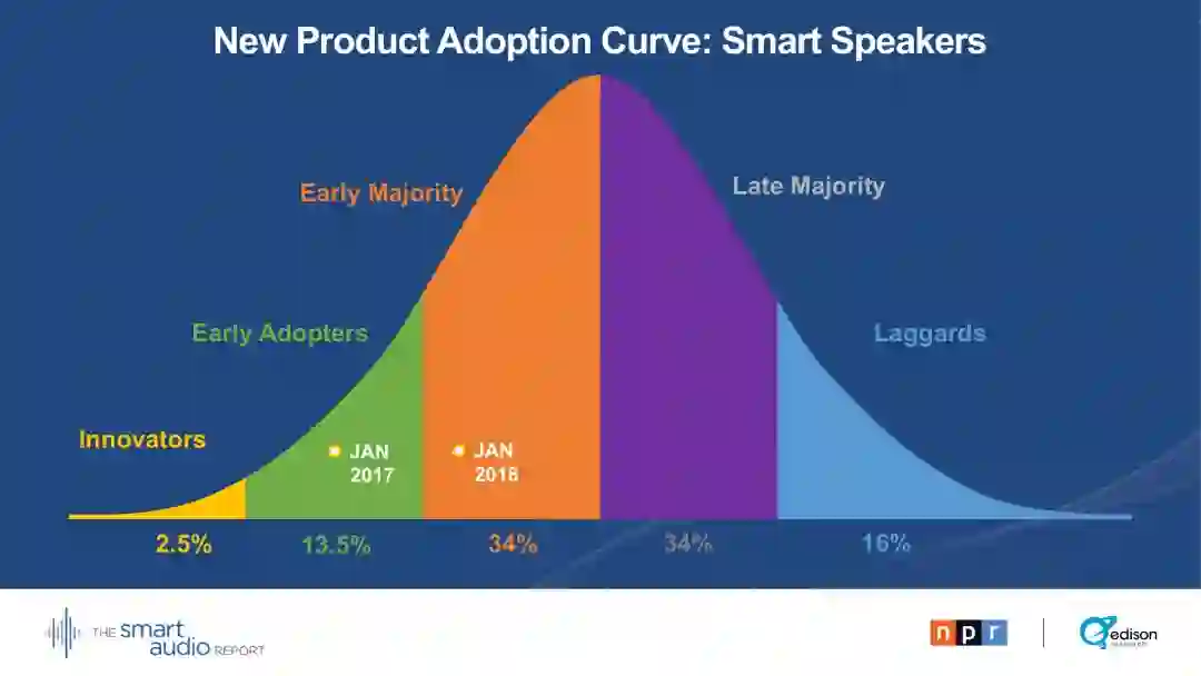 2018年7月18日统计智能扬声器在美国拥有量超过4300万台,这些设备迅速从第一批尝鲜用户扩展到主流市场用户。