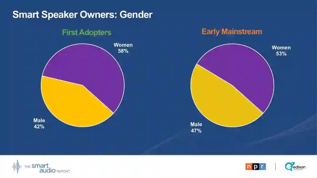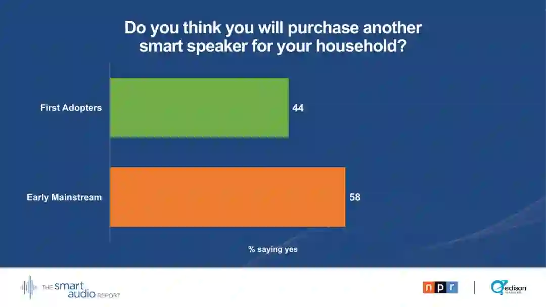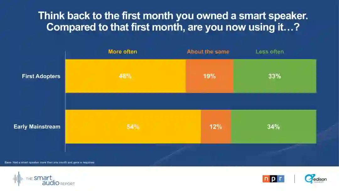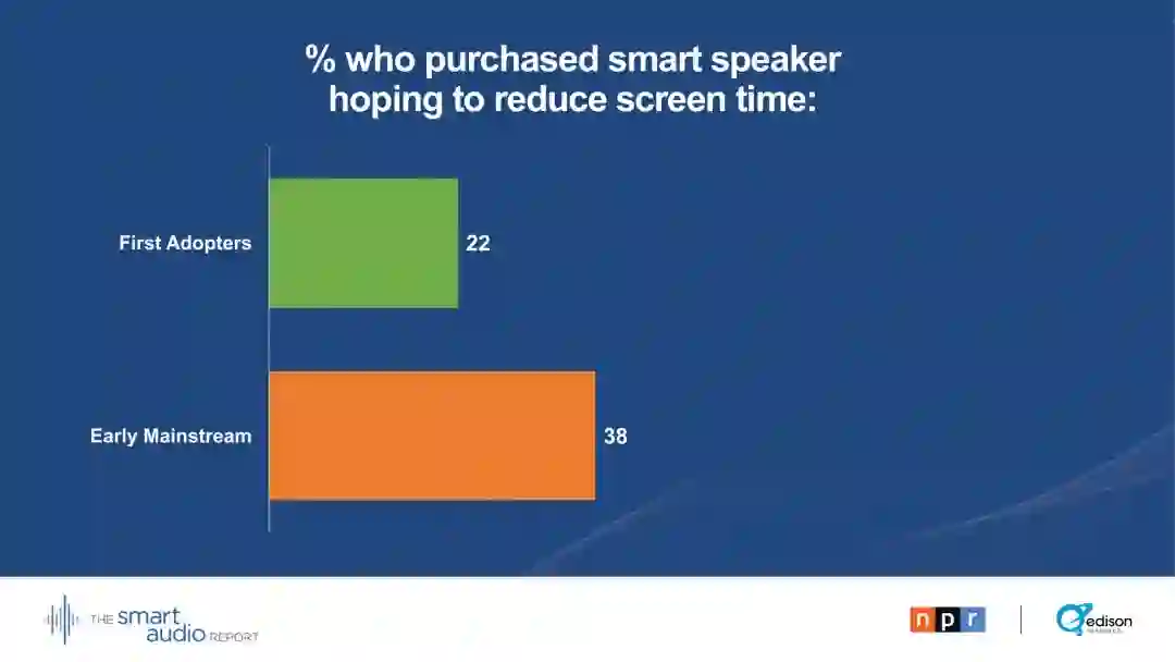 38%的早期主流用户表示,他们购买这种设备是希望缩短屏幕时间。47 %的早期主流用户大部分时间都在家里和其他人一起使用智能音箱。