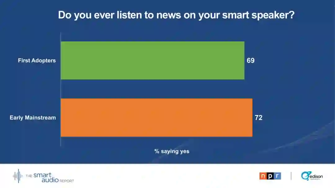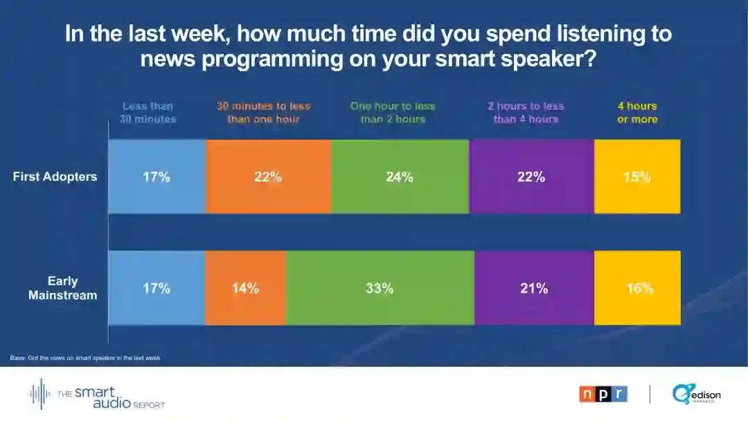 听新闻成为第一批智能音箱采用者和早期主流用户使用的重要驱动力: 37 %的智能音箱所有者在上周至少听了两个小时的新闻。根据2018年春季发布的消息,平台上有更多的新闻需求,这是推动智能音箱销售的一项动力。