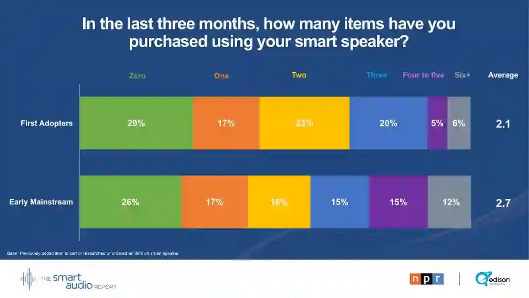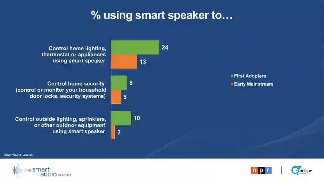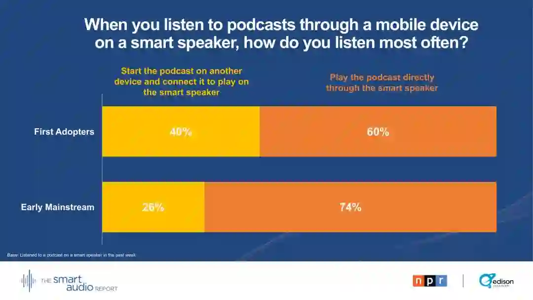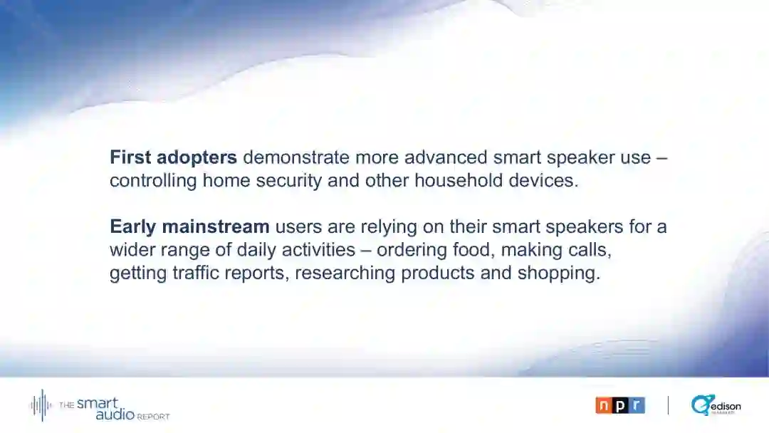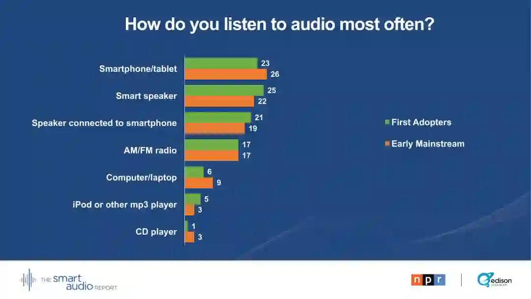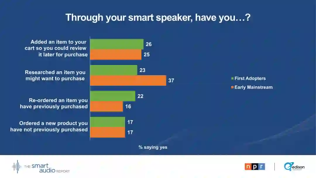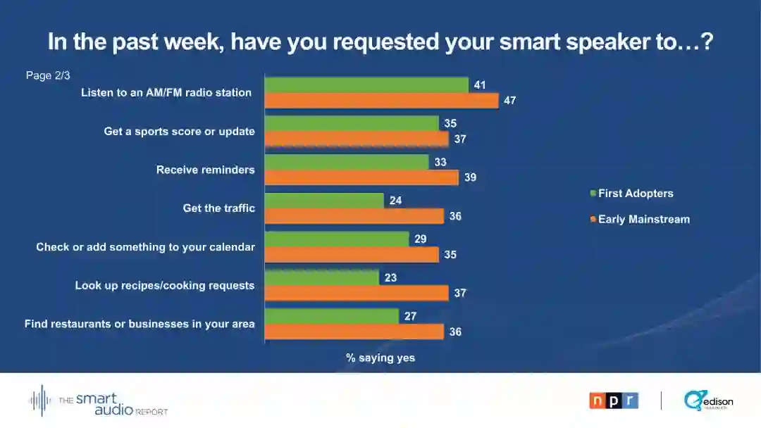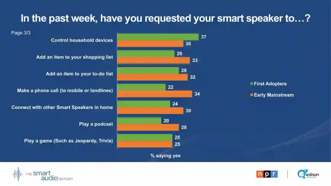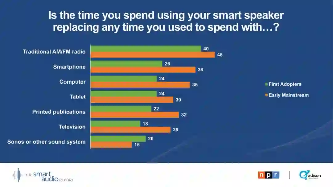 29 %的早期主流用户表示,他们的智能音箱正在取代电视。28 %的早期主流用户通过智能音箱收听播客。