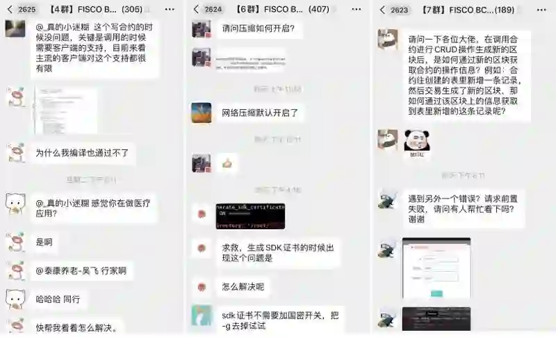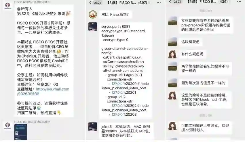 FISCO BCOS作为较早拥抱开源的联盟链底层平台,以开源连接起上万名个人开发者和超过500家企业及机构,拥有最大最活跃的国产开源联盟链生态圈,其技术群每天都有大量的技术讨论,甚至直接在群里飚代码;即使在凌晨询问,也能得到瞬间回复。此外,FISCO BCOS还在每周四在群里定期开展区块链小课堂,由技术大牛和资深社区成员进行话题分享。日常画风如下: