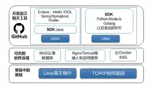 接着,就到了网络层,因为区块链是分布式系统,节点之间是通过网络相连接的,所以你还需要了解一些网络概念。但网络概念不需要有多精通,你只需要知道什么是TCP/IP、公网/内网/本地地址的区别、端口如何配置、节点与节点,以及SDK与节点之间是否会被防火墙和网络策略挡住等即可。一般来说,Linux书籍都会介绍这部分内容。