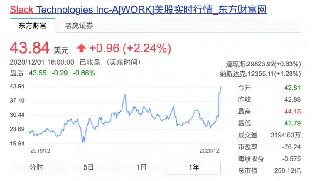 Slack于2019年6月在纽交所上市,该股当时开盘价为38.50美元。今年的疫情,让Slack的股价坐上过山车:3月交易价格跌至17美元,随后在6月回升至接近40美元,然后在11月中旬跌破25美元。