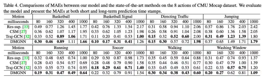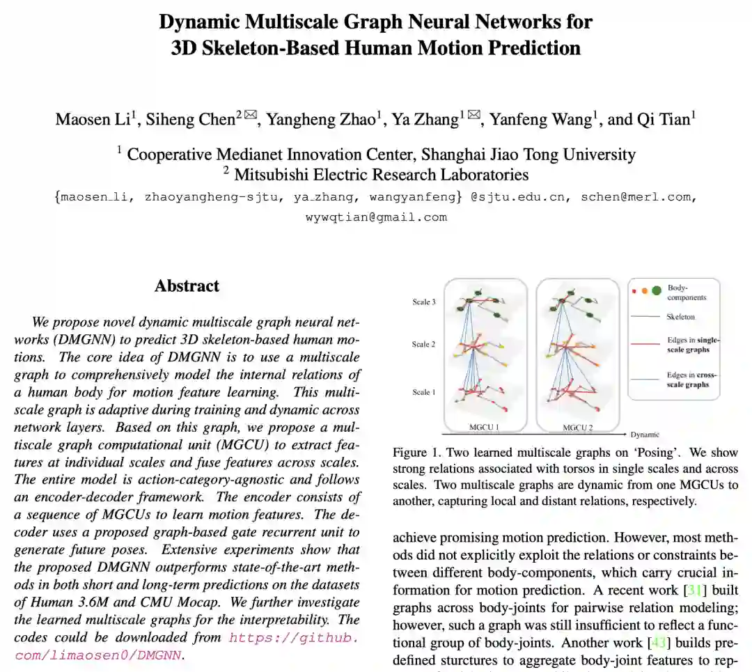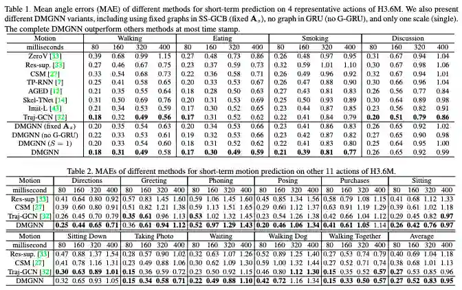 上海交大、三菱电机实验室联合提出将人体骨架建模为一个可学习的多尺度图,并且对不同层次的特征,多尺度图呈现动态变化。通过学习综合的多尺度特征表达,DMGNN实现了更准确的未来运动预测,超越SOTA。