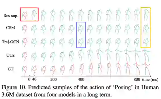 通过生成样本可视化,可以看出,相比于众多前人工作,DMGNN可以生成准确且合理的未来动作;而其他方法,容易在短期或长期出现较大的误差或偏移。