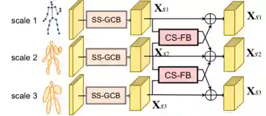 其中SS-GCB利用单尺度图的空间图卷积以及时间卷积提取单个尺度中运动的时空特征;