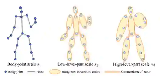 为了建模人体中综合的关联关系,作者提出建立多尺度图,其中图的节点是不同尺度下的身体部位,边为身体部位之前的关系。