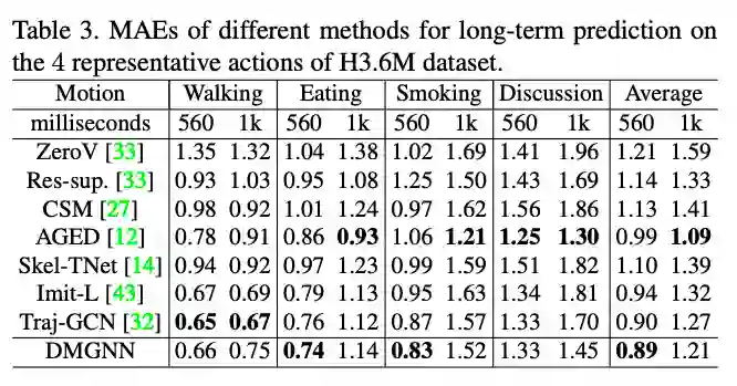 本文证明了DMGNN对比state-of-the-art方法,可以实现准确且合理的短期或长期人体运动预测