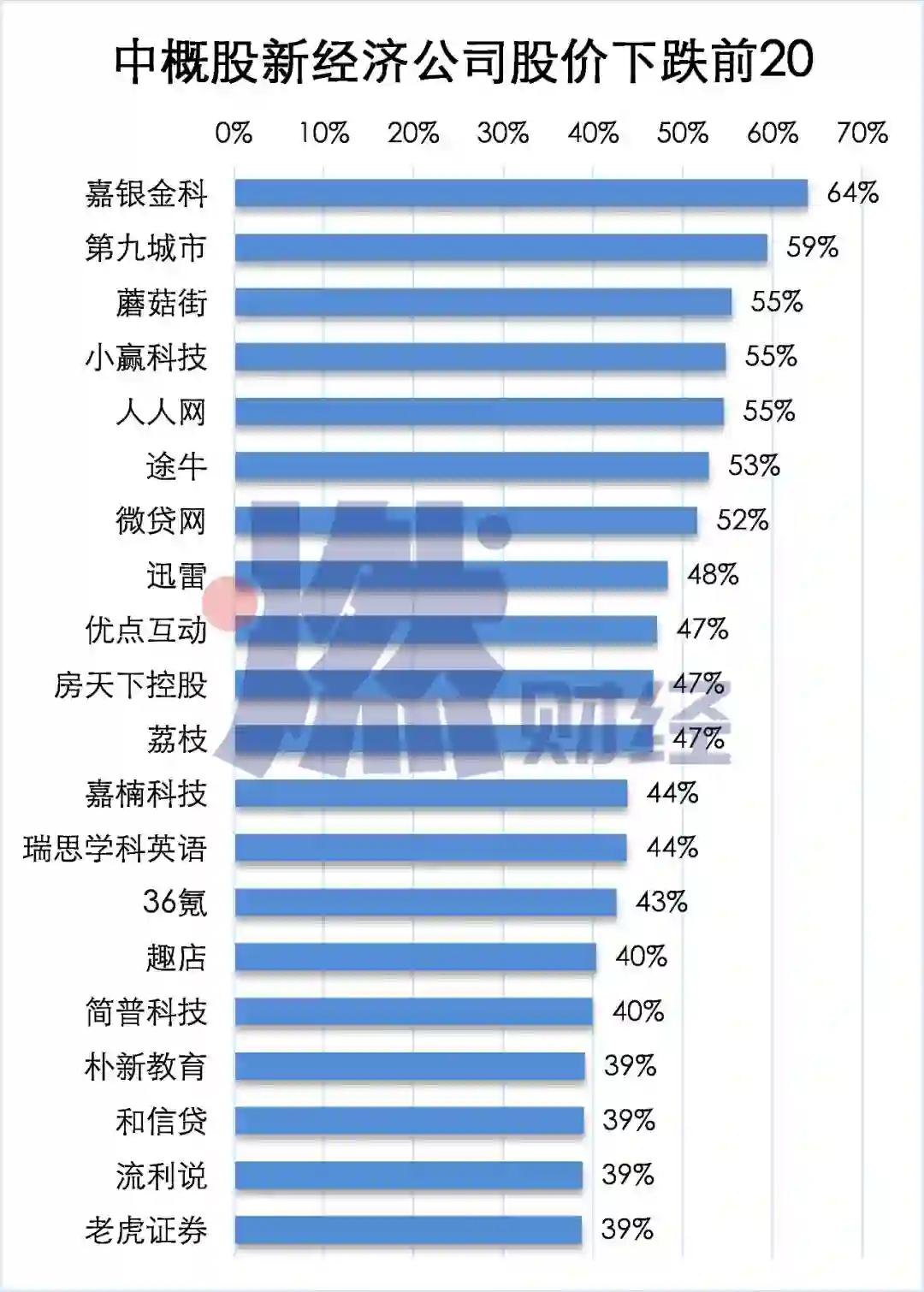 先看美股。整体而言,在美上市的100多家新经济公司,85%股价下跌,15%股价上涨,平均跌幅为20%。以下是中概股跌幅最大的20家新经济公司。