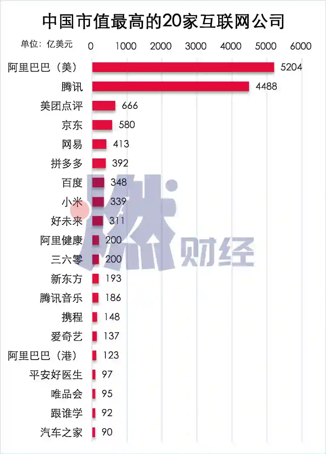 从图中可以看到,中国互联网前五的排位,已经变成了阿里、腾讯、美团、京东、网易,拼多多排在第六,百度则被甩到了第七。这20强中,阿里占了三个,美股的阿里、港股的阿里,还有一个阿里健康,市值都排在中国互联网前20。