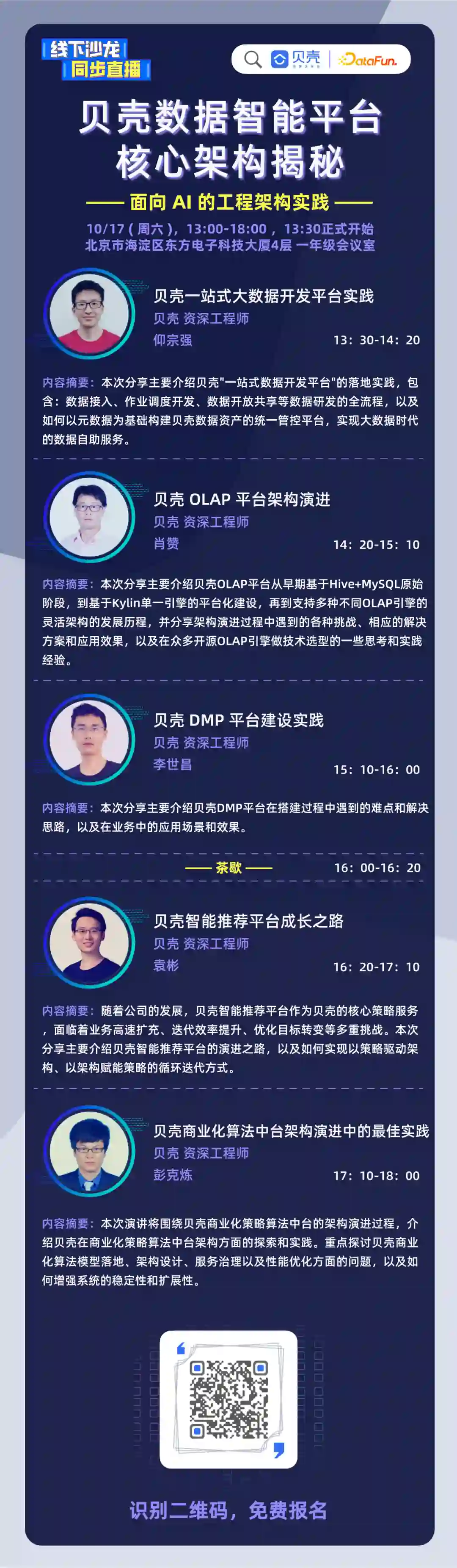 10月17日,13:00-18:00(13:30正式开始),由DataFunTalk联合贝壳数据智能中心主办的贝壳数据智能平台核心架构揭秘将邀请来自贝壳的五位嘉宾,进行线下线上同步分享。