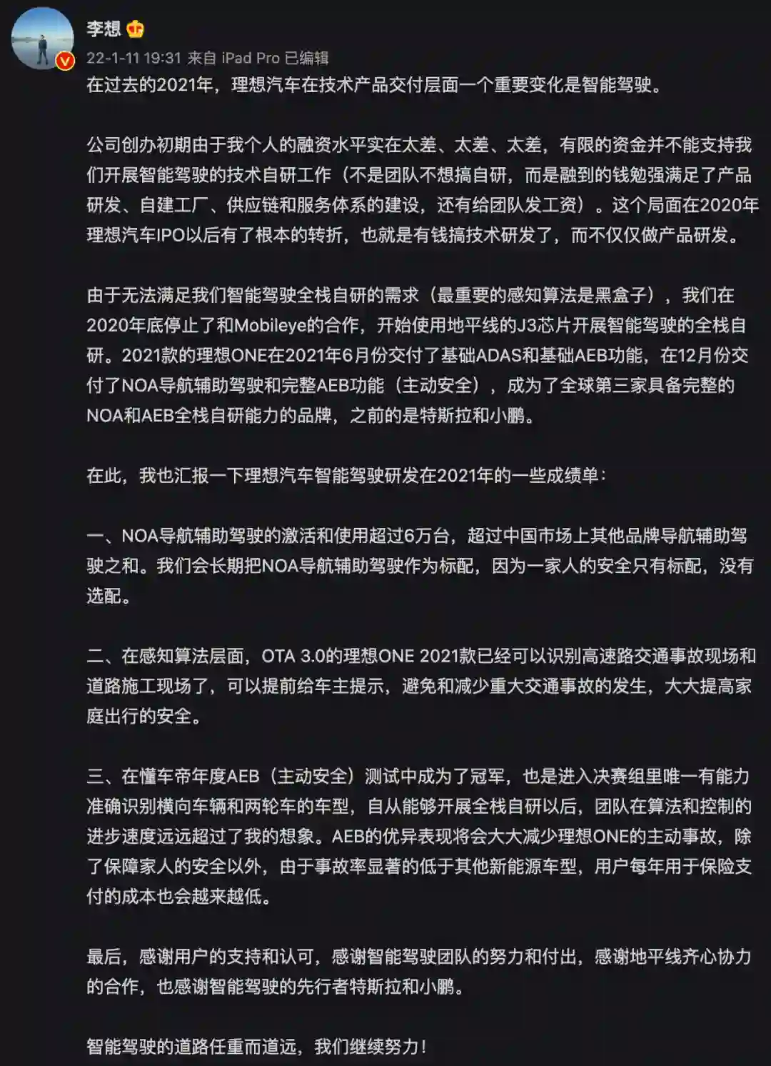 1月11日,理想汽车CEO李想发布微博长文,复盘了理想ONE智能驾驶研发在2021年的一些成绩。