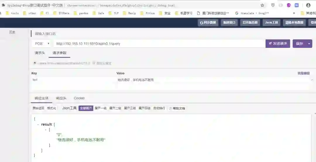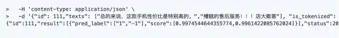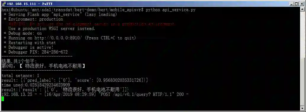 可以看到对应的两个评论,预测结果一个是1,另一个是-1,计算的速度还是非常很快的。通过这种方式来调用还是不太方便,知道了这个通讯方式,我们可以用flask编写一个API服务, 为所有的应用统一提供服务。