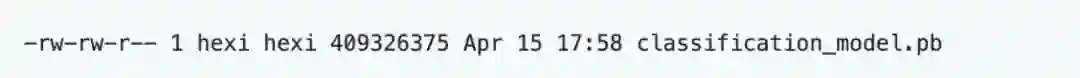 执行成功后可以看到在model_dir目录会生成一个classification_model.pb 文件。转为.pb格式的模型文件,同时也可以缩小模型文件的大小,可以看到转化后的模型文件大约是390M。