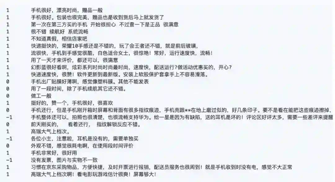 这里用的数据是手机的评论,数据比较简单,三个分类: -1,0,1 表示负面,中性与正面情感 数据格式如下: