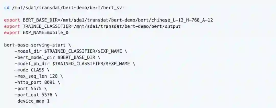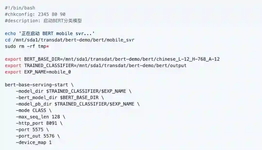运行服务后会自动生成很多临时的目录和文件,为了方便管理与启动,可建立一个工作目录,并把启动命令写成一个shell脚本。这里创建的是mobile_svr\bertsvr.sh ,这样可以比较方便地设置服务器启动时自动启动服务,另外增加了每次启动时自动清除临时文件
