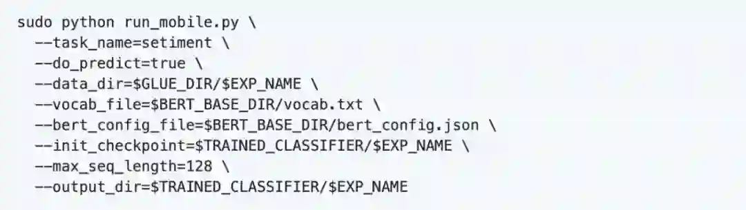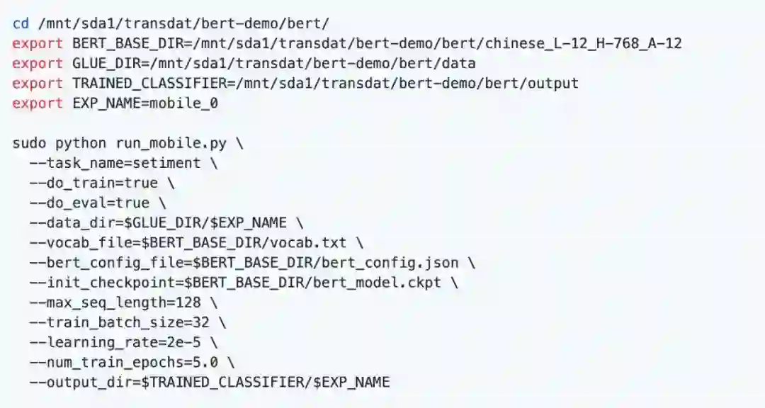训练模型就直接使用BERT的分类方法,把原来的run_classifier.py 复制出来并修改为 run_mobile.py。关于训练的代码网上很多,就不展开说明了,主要有以下方法: