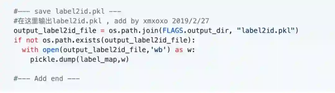 特别说明,这里有一点要注意,在后期部署的时候,需要一个label2id的字典,所以要在训练的时候就保存起来,在convert_single_example这个方法里增加一段: