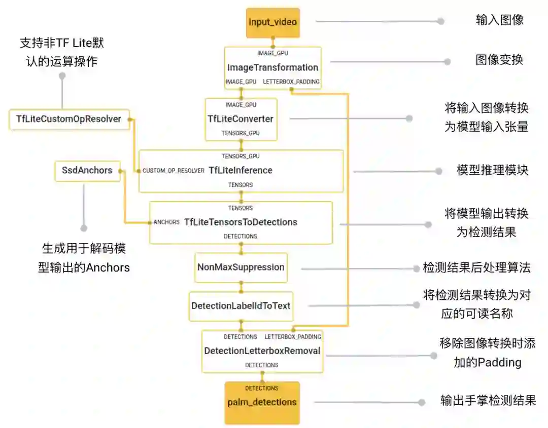 手掌检测应用的核心部分为上图中的蓝紫色模块(HandDetection子图)。如下图所示,HandDetection 子图包含了一系列图像处理的计算单元和机器学习模型推理的模块。ImageTransformationCalculator 将输入的图像调整到模型可以接受的尺寸,用以送入 TF Lite 模型的推理模块;使用 TfLiteTensorsToDetectionsCalculator,将模型输出的 Tensor 转换成检测结果;运用 NonMaxSuppressionCalculator 等计算单元做后处理;最终从HandDetection子图输出检测结果给主图。