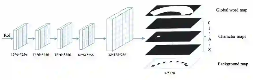 它将输入的RoI(固定大小16*64)经过4层卷积层和1层反卷积层,生成38通道的图(大小32*128),包括一个全局文本实例图——它给出了文本区域的精确定位,无论文本排列的形状如何它都能分割出来,还包括36个字符图(对应于字符0~9,A~Z),一个字符背景图(排除字符后的的所有背景区域),在后处理阶段字符背景图会被用到。