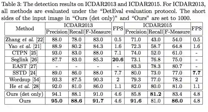 在 ICDAR2013、ICDAR2015和Total-Text数据库上的实验表明,所提出的方法在场景文本检测和端到端文本识别任务中都达到了state-of-the-art的水平。