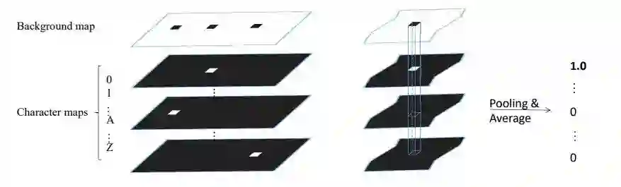 如上图所示,Pixel voting 方法根据字符背景图中每一个联通区域,计算每一字符层相应区域的平均字符概率,即得到了识别的结果。