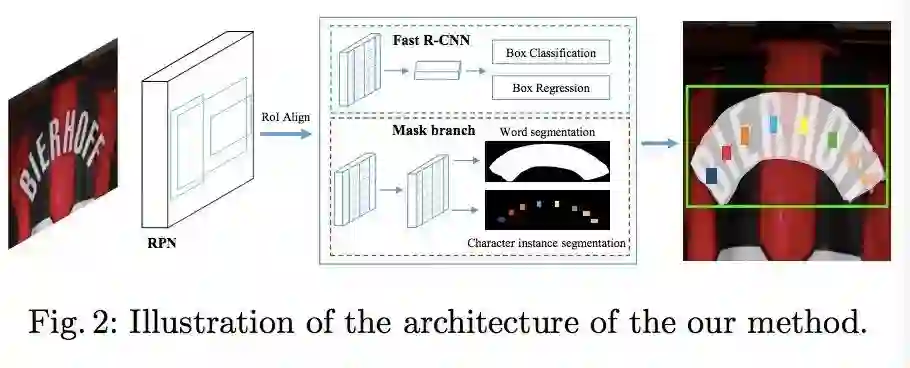 RPN首先生成大量的文本候选区域,然后这些候选区域的RoI特征被送入Fast R-CNN branch和mask branch,由它们去分别生成精确的文本候选包围盒(text candidate boxes)、文本实例分割图(text instance segmentation maps)、字符分割图(character segmentation maps)。