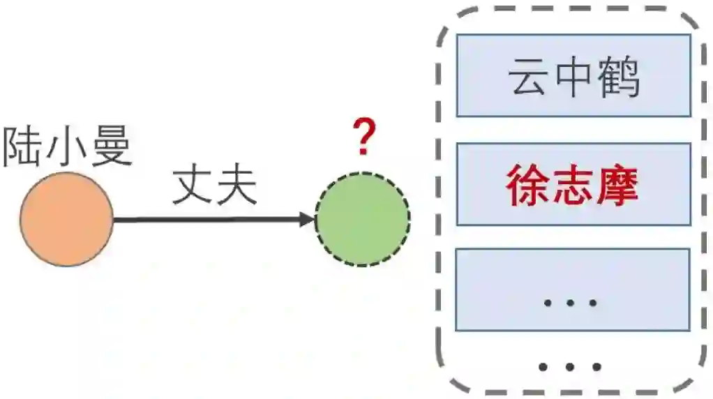 知识图谱补全 (Knowledge Graph Completion),是根据知识图谱中已有的三元组去对未知三元组进行预测。我们使用 表示已知头实体和关系来预测尾实体, 表示已知关系和尾实体来预测头实体,其中 和 被称为查询 (Query)。实际上,知识图谱补全任务,本质上给定查询下的排序问题。比如,对于图2所示的查询 (陆小曼,丈夫,?),返回的是预测答案的排序列表,正确答案排名越高,预测的效果就越好。